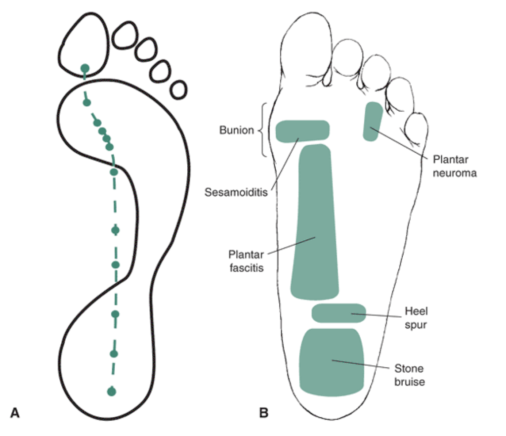 - Dựa vào chiều cao của vòm trong có thể chia làm bàn chân bình thường, hõm (vòm cao) và bẹt (bàn chân bằng). Bàn chân hõm có phần giữa bàn chân không chạm đất, có khả năng hấp thu lực kém. Ngược lại, bàn chân bẹt, thường tăng vận động, có mặt lòng bàn chân tiếp đất nhiều nhất và làm yếu mặt trong. Loại bàn chân này thường kết hợp với quay sấp quá mức suốt thì tựa của dáng đi.