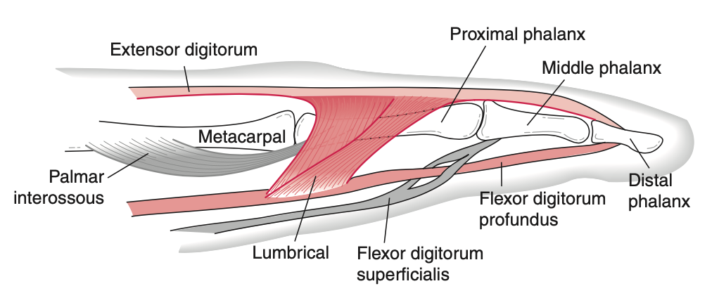 - Gấp ngón ở khớp MCP do cơ giun và gian cốt. Các cơ này cũng trợ giúp duỗi khớp IP. Do đó để gấp cả ba khớp MCP, PIP, và DIP, các cơ gấp ngón dài phải thắng thành phần duỗi của cơ giun và gian cốt (tư thế tốt nhất là kết hợp duỗi cổ tay).