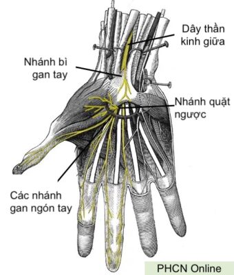 - Nhánh bì gan tay: Tách ra ở phần dưới cẳng tay, trước khi thần kinh giữa đi vào ống cổ tay. Nhánh này đi nông trên mạc giữ gân gấp và chi phối cảm giác cho vùng da ở nền mô cái và phần giữa lòng bàn tay. Do không đi qua ống cổ tay, cảm giác vùng này thường không bị ảnh hưởng trong hội chứng ống cổ tay điển hình.