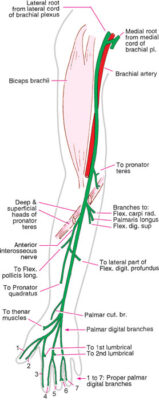 - Các nhánh cơ: Chi phối cho cơ sấp tròn, cơ gấp cổ tay quay , cơ gan tay dài, và cơ gấp các ngón nông.