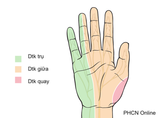 - Ở bàn tay (qua nhánh quặt ngược và các nhánh ngón tay):
