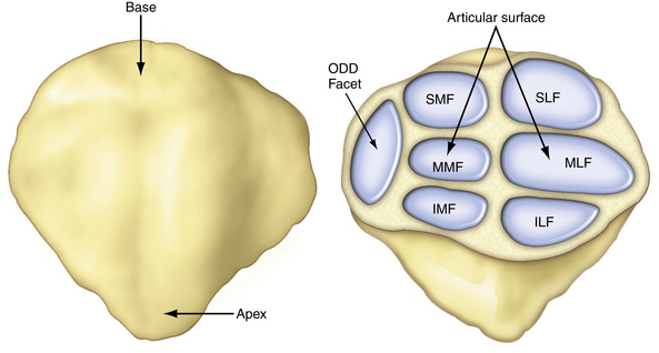 Mặt sau của xương bánh chè được bao phủ bởi một lớp sụn rất dày. Một gờ xương dọc chia mặt sau xương bánh chè thành các mặt trong và ngoài, và mỗi mặt có thể được chia thành mặt khớp nhỏ trên, giữa và dưới. Có một mặt thứ bảy, được gọi là mặt lẻ (odd facet), ở mặt trong cùng của xương bánh chè. Trong động tác gấp duỗi bình thường, thường có năm mặt khớp nhỏ này tiếp xúc với xương đùi.