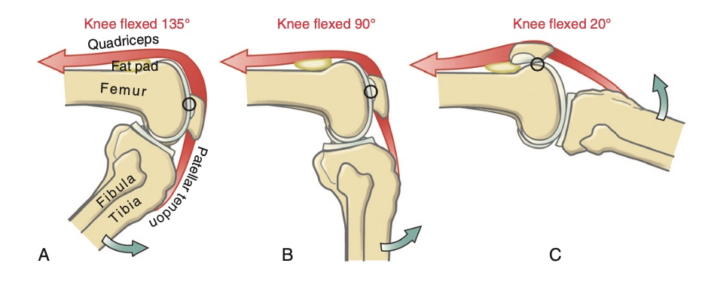 - Khi gối gấp xương bánh chè đi xuống với quãng đường khoảng hai lần chiều dài của nó. Khi gối duỗi, xương bánh chè trở lại vị trí nghỉ ở trên ngoài xương đùi trên rãnh ròng rọc ở đệm mỡ trên xương bánh chè. Ở tư thế gấp vận động xương bánh chè hạn chế do gia tăng tiếp xúc với xương đùi.