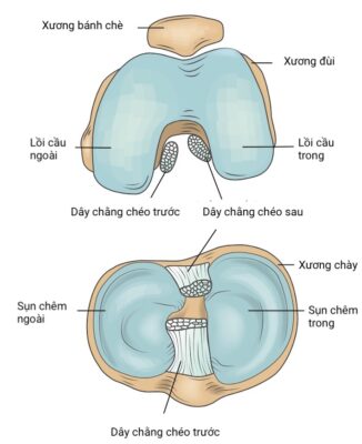 Có ba khớp ở vùng gọi là khớp gối: khớp chày đùi, khớp bánh chè đùi, và khớp chày mác trên.