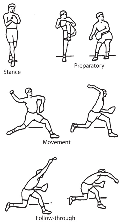 - Giai đoạn chuẩn bị bắt đầu bằng duỗi tay đưa ra sau và xoay thân sang phải cùng với gấp háng trái. Đai vai phải đưa ra sau kết hợp với dạng, xoay ngoài tối đa khớp ổ chảo cánh tay để hoàn thành giai đoạn này.