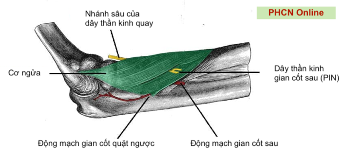 Lưu ý: Khi nhánh sâu của dây thần kinh quay xuyên qua cơ ngửa của cẳng tay, nó được gọi là dây thần kinh gian cốt sau (posterior interosseous nerve, PIN) trong phần còn lại của đường đi.