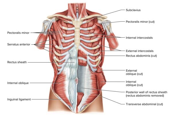 | Trước | Cơ ức đòn chũm Các cơ bậc thang (3) Nhóm cơ trước đốt sống (4) | Cơ thẳng bụng Cơ chéo ngoài Cơ chéo trong Cơ ngang bụng |