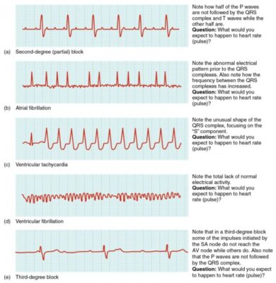 - Block AV độ I, II, III (đã mô tả): Cản trở xung từ nhĩ xuống thất. Block độ III gây phân ly nhĩ – thất, nguy cơ tử vong cao.