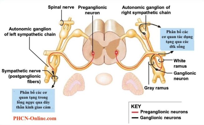 - Các chuỗi hạch giao cảm cạnh sống (sympathetic chain ganglia) nằm hai bên cột sống: Kiểm soát các thành phần tác dụng ở đầu, cổ, các chi và khoang ngực