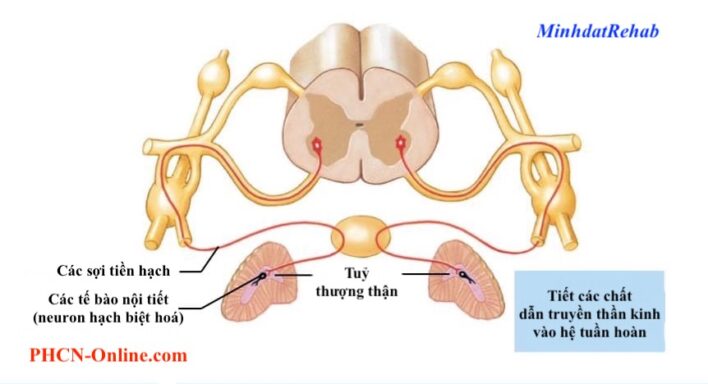 Các sợi sau đó tạo synap lên các neuron được sửa đổi mà khi bị kích thích sẽ giải phóng các chất dẫn truyền thần kinh hoạt động như những hormone: Epinephrine và norepinephrine