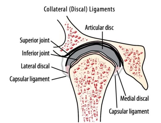 Khớp bao gồm các diện khớp sụn xơ và một đĩa khớp chia khớp thành 2 khoang. Các khoang trên và khoang dưới được lót bởi các màng hoạt dịch trên và dưới riêng biệt. Khoang khớp dưới chứa khoảng 0,9 ml hoạt dịch, và khoang khớp trên chứa khoảng 1,2 ml hoạt dịch, đóng vai trò bôi trơn giữa các mặt khớp trong khi hoạt động.