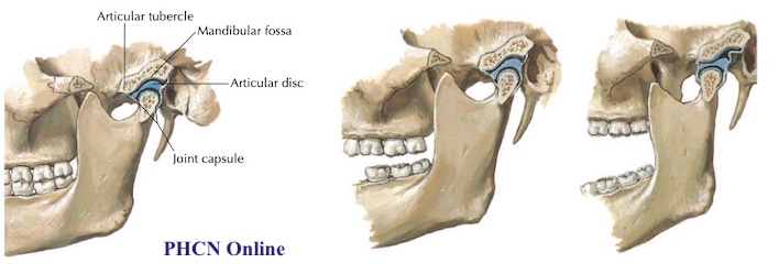 - Hạ xương hàm (mở hàm) liên quan đến 2 vận động: phần đầu tiên là xoay ra trước của lồi cầu trên đĩa, phần thứ hai liên quan đến trượt của đĩa và lồi cầu ra trước và xuống dưới. Nâng hàm (đóng hàm) là vận động ngược lại, bao gồm trượt của đĩa và lồi cầu ra sau và lên trên, xoay của lồi cầu ra sau trên đĩa. Các vận động này xảy ra trong mặt phẳng đứng dọc.