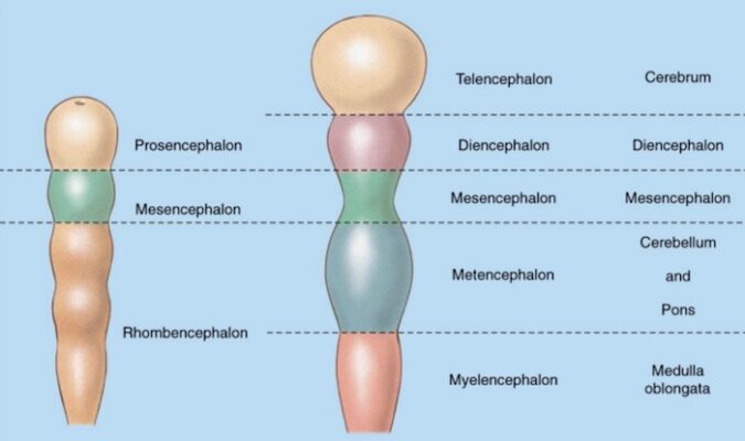 Vào tuần thứ tư, phần đầu ống nở rộng để tạo thành các bọng não (vesicles) bao gồm: