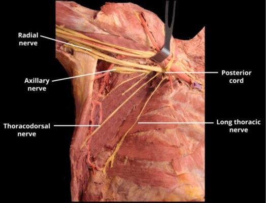 Lưu ý: Có một số bằng chứng từ nghiên cứu trên tử thi cho thấy dây thần kinh nách cũng có thể chi phối đầu ngoài của cơ tam đầu cánh tay.