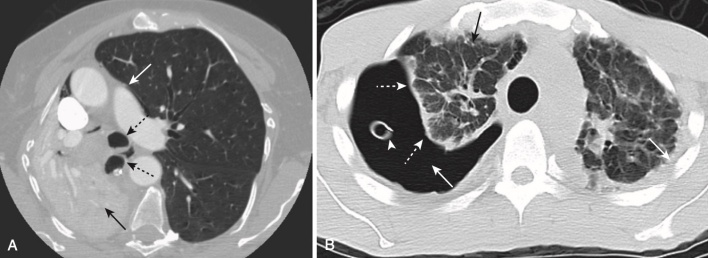 - Ở một bệnh nhân người lớn bị mờ nửa phổi, không có hình ảnh phế quản chứa khí và ít hoặc không có sự dịch chuyển của các cấu trúc lồng ngực di động, cần nghi ngờ một ung thư biểu mô tuyến phế quản gây tắc nghẽn, có lẽ có di căn đến màng phổi. Chụp cắt lớp vi tính (CT) ngực sẽ cho thấy những bất thường này (Hình 5).