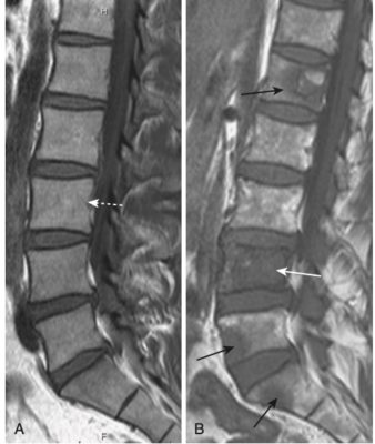 - Khoang tủy hầu như luôn bị ảnh hưởng, từ đó bệnh có thể ăn mòn và phá hủy cả vỏ xương. Khi chỉ ảnh hưởng đến khoang tủy, khối lượng xương phải giảm gần như 50% để có thể nhận biết được tổn thương khi nhìn trực diện trên phim X quang thông thường. Ngược lại, MRI rất hiệu quả trong đánh giá tình trạng của khoang tủy và do đó nhạy hơn nhiều so với chụp X quang thông thường về sự hiện diện của bệnh di căn (Hình 5).