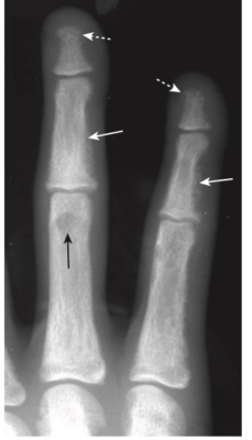 - Tiêu xương dưới màng xương, đặc biệt là ở mặt quay của đốt giữa của ngón trỏ và ngón giữa (Hình -2)