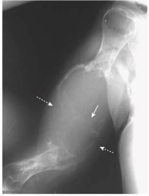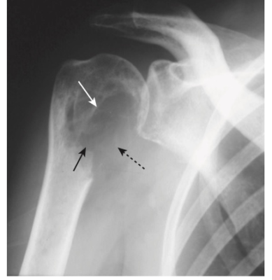 - Những tổn thương huỷ xương này thường có đặc điểm là thuộc một (hoặc đôi khi nhiều hơn) trong ba dạng: lấm tấm (permeative, thấm), dạng gặm nhấm (lốm đốm, mottled) hoặc có hình dạng bản đồ (geographic) theo thứ tự tăng kích thước của tổn thương từ nhỏ nhất và rời rạc nhất có thể nhìn thấy được (Hình 6).