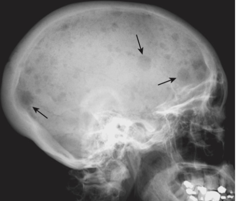 - Sau đó, ở dạng lan rải, có nhiều tổn thương huỷ xương có kích thước gần như nhau, nhỏ, khoanh tròn rõ ràng (được mô tả như ấn lỗ) hiện diện, thường không có phản ứng xơ cứng đi kèm quanh chúng (Hình 10).