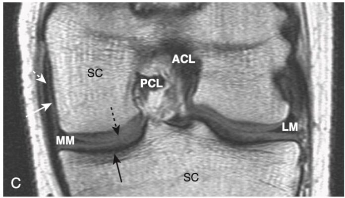 Hình 11. Chondrocalcinosis (Vôi hoá sụn). Chondrocalcinosis chỉ đề cập đến sự vôi hóa của sụn khớp (mũi tên trắng) hoặc sụn sợi và hầu hết không có triệu chứng. Nếu bệnh nhân này bị sưng, nóng, đỏ đau cấp tính, và hạn chế vận động khớp gối thì tình trạng này được gọi là giả gout.