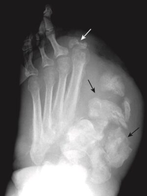 Hình 10. Bệnh khớp Charcot ở bàn chân. Bệnh nhân này trước đó đã được phẫu thuật cắt cụt ngón chân thứ hai (mũi tên trắng) vì hoại thư (gangrene) do tiểu đường, nhưng sự phá hủy và phân mảnh rõ rệt của ngón chân cái và các xương bàn chân là biểu hiện của bệnh thần kinh Charcot (mũi tên đen).