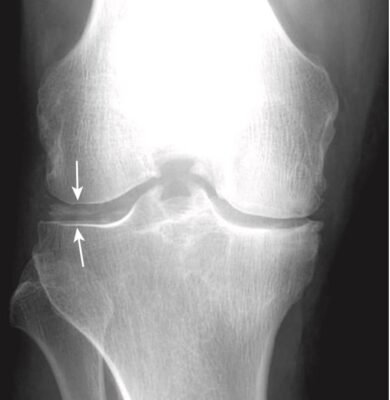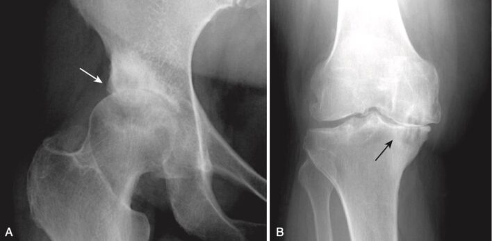 Hình 5. Thoái hóa khớp háng (A) và gối (B). Trong thoái hóa khớp, sự phá hủy của lớp sụn giữa các đầu xương dẫn đến hẹp khe khớp thường ở mặt chịu trọng lượng của khớp. A, Ở khớp háng, mặt trên và mặt ngoài chịu trọng lượng và do đó bị ảnh hưởng nhiều nhất (mũi tên trắng), trong khi ở gối (B), khoang trong chịu trọng lượng và bị ảnh hưởng nhiều hơn (mũi tên đen).