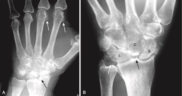 Hình 12. Bệnh lắng đọng calci pyrophosphate. A, Lồi xương hình móc câu dọc theo đầu xương bàn ngón thứ 2 và thứ 3 (mũi tên trắng); Hẹp khớp quay – cổ tay (mũi tên đen). B, Ở cổ tay, những phát hiện đặc trưng gồm sự vôi hóa sụn sợi tam giác (mũi tên trắng), sự phân ly của xương thuyền (S, scaphoid) và xương nguyệt (L, lunate), và sự sụp của xương cả (C, capitate) về phía xương quay (mũi tên đen), được gọi là sụp nặng thuyền – nguyệt, SLAC).