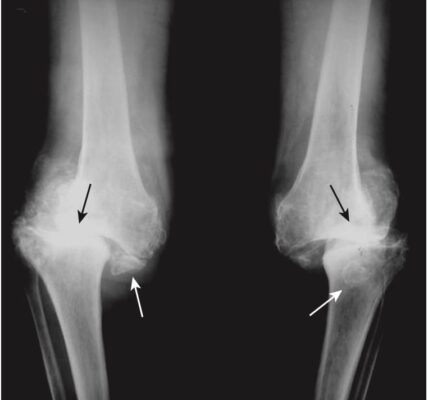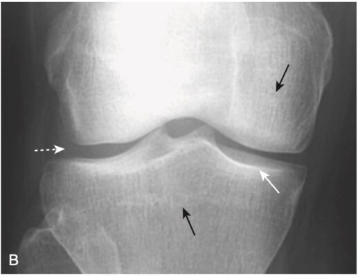 Hình 9. Bệnh khớp Charcot ở khớp gối do bệnh tiểu đường. Dấu hiệu đặc trưng của khớp Charcot là sự phân mảnh của xương xung quanh khớp, tạo ra nhiều mảnh xương nhỏ trong bao khớp (mũi tên trắng) và phá hủy khe khớp (mũi tên đen).