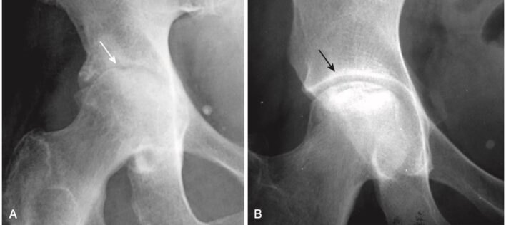 Hình 2. Hình ảnh nào là viêm khớp? A, Có hẹp khe của khớp háng, và cả chỏm xương đùi và ổ cối đều bất thường (mũi tên trắng). Đây là bệnh thoái hóa khớp háng. B, Có bất thường chỏm xương đùi (đặc xương), nhưng khe khớp còn nguyên vẹn, cũng như ổ cối (mũi tên đen). Đây là hoại tử vô mạch của chỏm xương đùi.