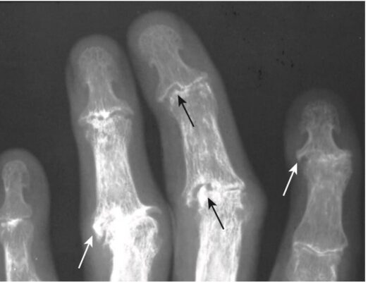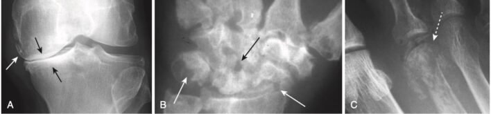 Hình 8. Thoái hóa khớp ăn mòn. Các dấu ăn mòn thường nằm ở trung tâm trong khớp (mũi tên đen) và kết hợp với các gai xương nhỏ (mũi tên trắng), tạo nên biến dạng cánh mòng biển.