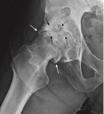 Hình 4. Thoái hoá khớp. Các dấu hiệu nhận biết của bệnh thoái hóa khớp được minh hoạ ở khớp háng phải của bệnh nhân này. Có sự tạo gai xương ở rìa khớp (mũi tên trắng đặc), đặc xương dưới sụn (mũi tên đen đặc) và hình thành các nang dưới sụn (mũi tên đen chấm).
