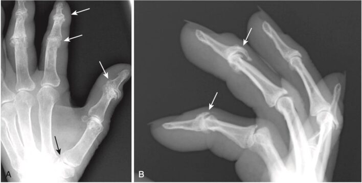 - Lồi xương dạng móc câu (hook-shaped bony excrescences) dọc theo đầu xương bàn đốt ngón 2 và 3 là một dấu hiệu thường gặp (xem Hình 12, A).