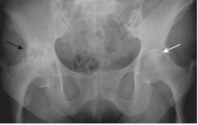 Hình 7. Thoái hóa khớp thứ phát ở khớp háng phải. Có sự khác biệt rõ rệt giữa hai khớp háng: trong khi háng bên phải bị thoái hóa khớp nặng (mũi tên đen) thì khớp háng bên trái tương đối bình thường (mũi tên trắng). Bệnh nhân này bị trượt chỏm xương đùi (SCFE) bên phải và chưa từng được chăm sóc điều trị.