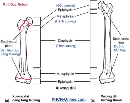 Nhắc lại cấu các phần của một xương dài đang phát triển và trưởng thành : đầu xương, bản tiếp hợp (sụn tăng trưởng), hành xương, thân xương (hình 4).