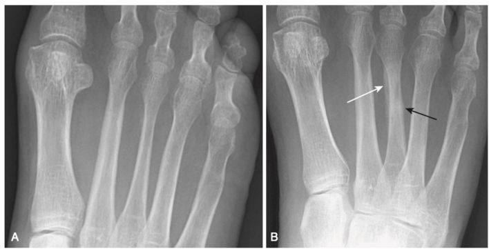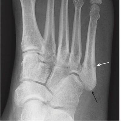 - Gãy Jones là một gãy ngang của xương bàn đốt chân ngón út cách nền xương khoảng 1 đến 2 cm, do gập lòng bàn chân và cổ chân vẹo trong. Gãy xương Jones thường lâu lành hơn so với gãy bong mảnh bám nền xương bàn đốt ngón chân út (là loại gãy thường gặp hơn, dancer’s fracture) (Hình 12).