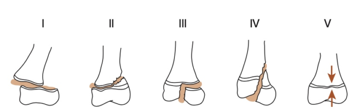 - Loại IV – gãy bản sụn, hành xương và đầu xương (fracture of the epiphyseal plate, metaphysis, and epiphysis)