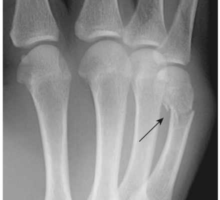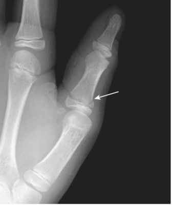 - Gãy xương của võ sĩ quyền anh (Boxer’s fracture): gãy cổ của xương bàn đốt ngón tay thứ 5 (ngón út) với di lệch gập góc về lòng bàn tay của đầu xa. Đôi khi cũng bị thêm xương bàn đốt ngón thứ 4. Gãy xương này thường do đấm tay vào người hoặc vào tường (Hình 13). Dù tên gọi võ sĩ quyền anh, những võ sĩ chuyên nghiệp thường không bị loại gãy này (lực đấm đúng thường tác động lên các xương đốt bàn ngón 2 và ngón 3 và xương quay).