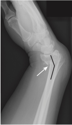 - Tìm kiếm sự gập góc đột ngột, nhọn của vỏ xương, đặc biệt là gần cổ tay (xem Hình 1, bài Chẩn đoán gãy xương). Đây là những gãy xương do va đập và thường lành nhanh chóng mà không bị biến dạng.