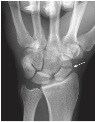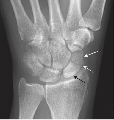- Do đặc trưng phân bố mạch máu, gãy ngang eo xương thuyền ở cổ tay làm gián đoạn nguồn cung cấp máu đến cực trên, trong khi phần còn lại của xương cổ tay tiếp tục trải qua quá trình luân chuyển xương, mất khoáng. Kết quả là sự gia tăng tương đối rõ ràng về đậm độ xương của phần trên không được phân nuôi dưỡng so với phần còn lại của xương (Hình 15).