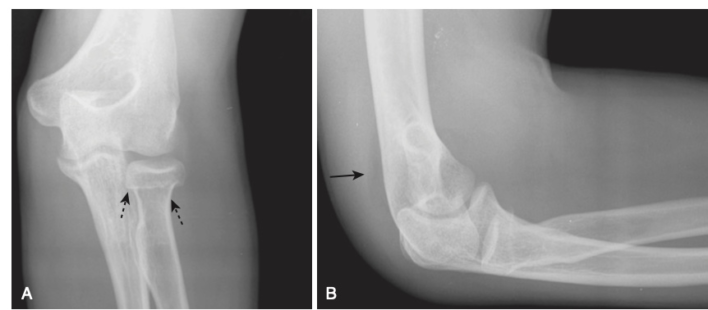 | Tràn dịch khớp | Ví dụ dấu hiệu đệm mỡ phía sau dương tính nhìn thấy ở mặt lưng của đầu dưới xương cánh tay do tràn dịch khớp do chấn thương (xem Hình 16, B). |