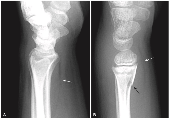 | Sự biến mất của các dải mỡ bình thường | Ví dụ như dải mỡ cơ sấp vuông (pronator quadratus) trên mặt lòng của cổ tay, có thể bị dịch chuyển do gãy đầu dưới xương quay (xem Hình 20). |