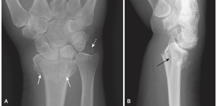 - Gãy Pouteau -Colles: gãy đầu dưới xương quay với đầu gãy di lệch gập góc mu tay, do ngã chống bàn tay (fall on the outstretched hand, FOOSH). Thường kèm theo gãy mỏm trâm trụ (ulnar styloid) (Hình 10).