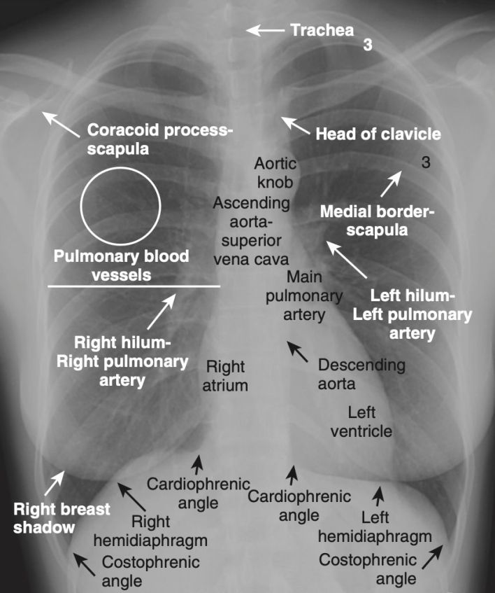 - Hình 3 hiển thị một số đặc điểm giải phẫu bình thường có thể nhìn thấy trên phim X quang ngực nghiêng.