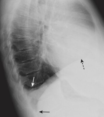 - Không khí trong dạ dày hoặc đại tràng góc lách nhìn thấy ngay dưới nửa cơ hoành trái. Gan nằm bên dưới nửa cơ hoành phải, và thường không thấy hơi ruột giữa gan và nửa cơ hoành phải.