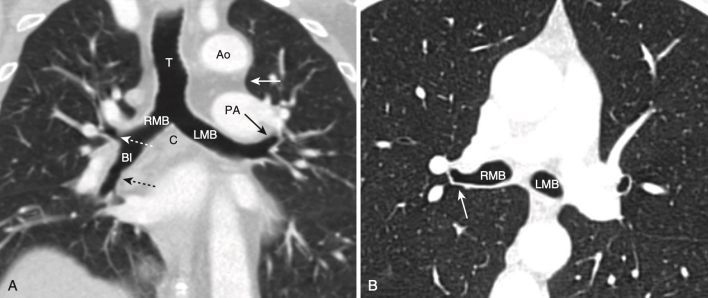 - Thấp hơn một chút là phế quản chính phải và trái và các phế quản trung gian. Phế quản chính bên phải có hình dạng một cấu trúc hình tròn, chứa khí và sẽ trở thành hình ống khi phế quản thùy trên bên phải xuất hiện. Sau phế quản trung gian không có gì ngoài mô phổi (Hình 15).