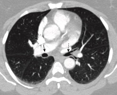 - Phế quản chính bên trái sẽ có dạng hình tròn chứa khí ở bên trái.