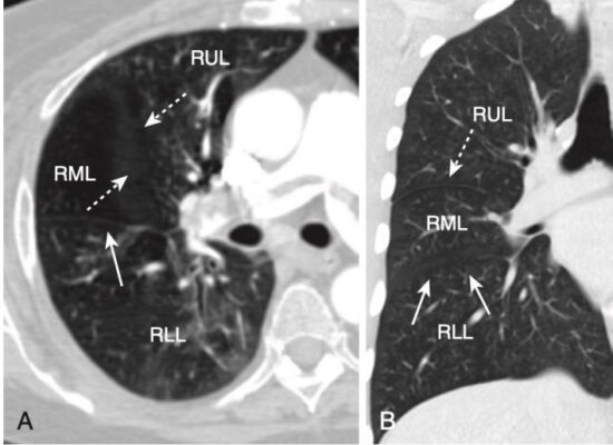 - Trên phim nghiêng, có thể nhìn thấy cả rãnh lớn (chéo) và bé (ngang) dưới dạng các đường nhỏ, màu trắng (dày khoảng bằng đường kẻ bằng đầu bút chì). Các rãnh phân định các thùy trên và dưới ở bên trái và các thùy trên, giữa và dưới ở bên phải.