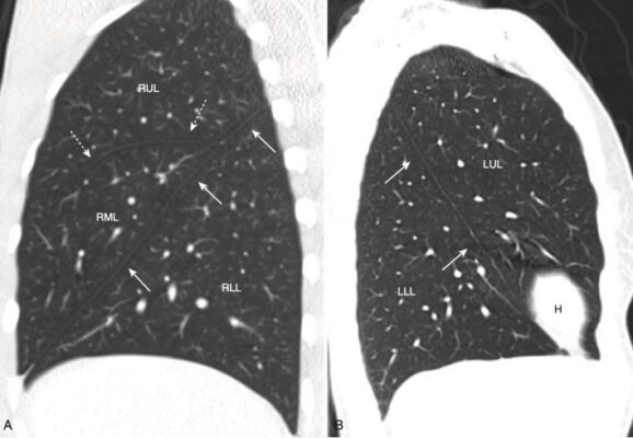 - Tùy thuộc vào độ dày của lát cắt, các rãnh sẽ có thể nhìn thấy dưới dạng các đường trắng mỏng hoặc bằng một dải vô mạch dày khoảng 2 cm khi chúng đi chéo qua phổi (Hình 16).
