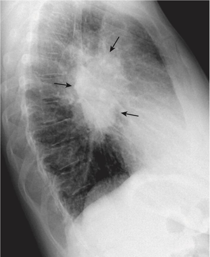 - Khi có một khối ở rốn phổi, chẳng hạn như các hạch lympho to ra, rốn phổi (hoặc cả hai rốn phổi) sẽ tạo ra một bóng mờ hình khối, có thùy, rõ rệt trên phim chụp X quang nghiêng (Hình 7).