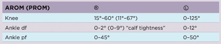 A 69-year-old patient underwent a ® total knee arthroplasty yesterday. He is pleasant and cooperative, but somewhat drowsy from the anesthesia. He is oriented to person, place, and time. He rates his ® knee pain at 4/10 (at rest) and 7/10 (with motion). He reports that he has not been out of bed since surgery. The goal for the day is to assess transfers and ability to ambulate. AROM assessment of the upper extremities reveals no deficits, and the L hip, knee, and ankle motions all demonstrate adequate range for bed mobility, transfers, and gait. When the patient is asked to flex the ® knee, it is obvious that this causes pain, but the patient is able to achieve approximately 50% of normal range. When he is asked to straighten the ® knee as far as possible, he can achieve close to full extension, but less than the unaffected side. Using a goniometer, you find that his knee flexion AROM is 60° and PROM is 67°. His AROM knee extension is lacking 15° from neutral and PROM extension is lacking 11° from neutral. The patient’s ® ankle AROM appears equal to that of the L except in the direction of dorsiflexion. Goniometric measure of ® ankle dorsiflexion shows the patient can achieve 2° actively and 9° passively with patient stating the back of his calf feels very tight with this motion.